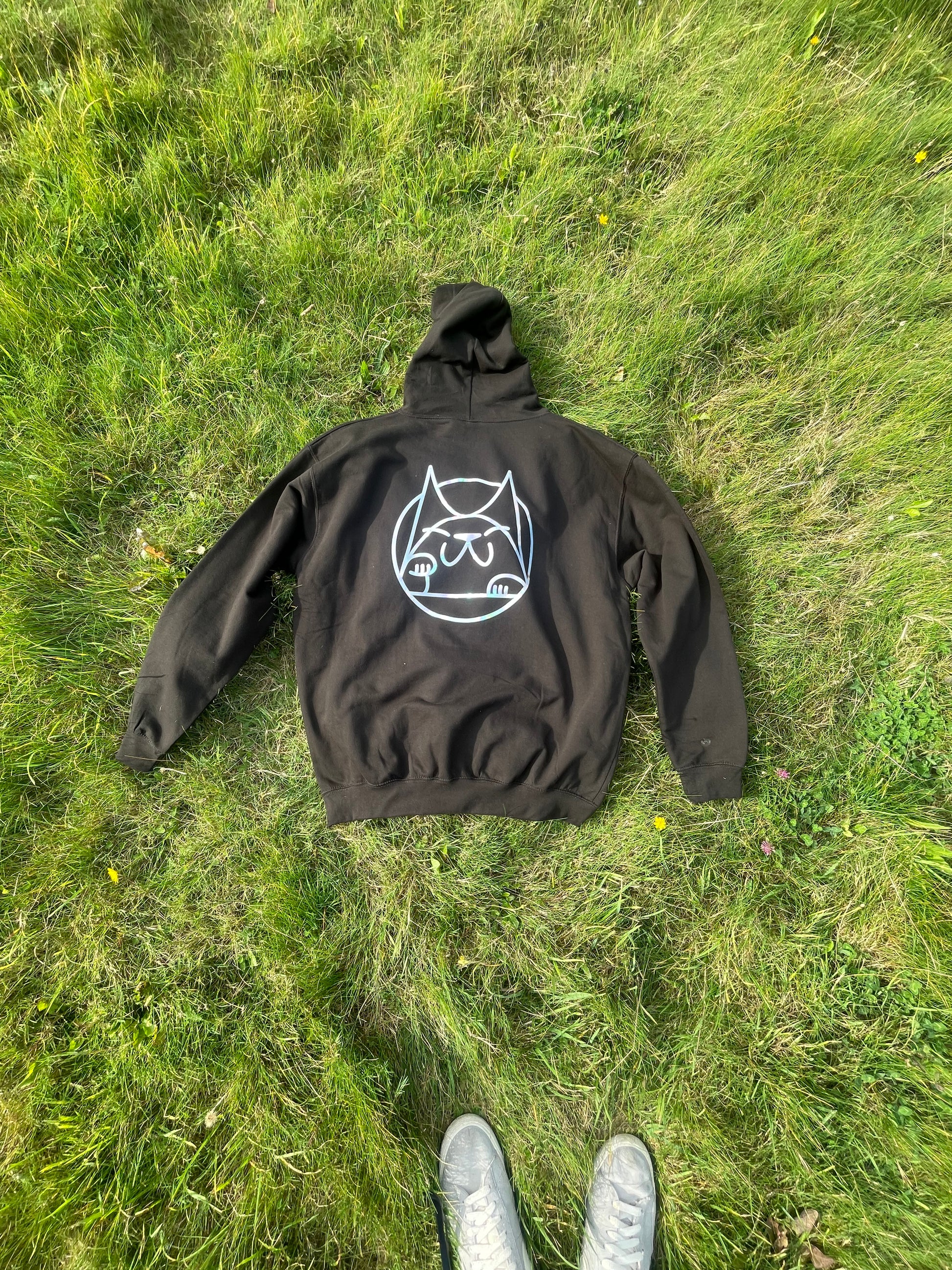 CatNeil Hoodies! Big holographic cat on the back, little cat tag on the front.